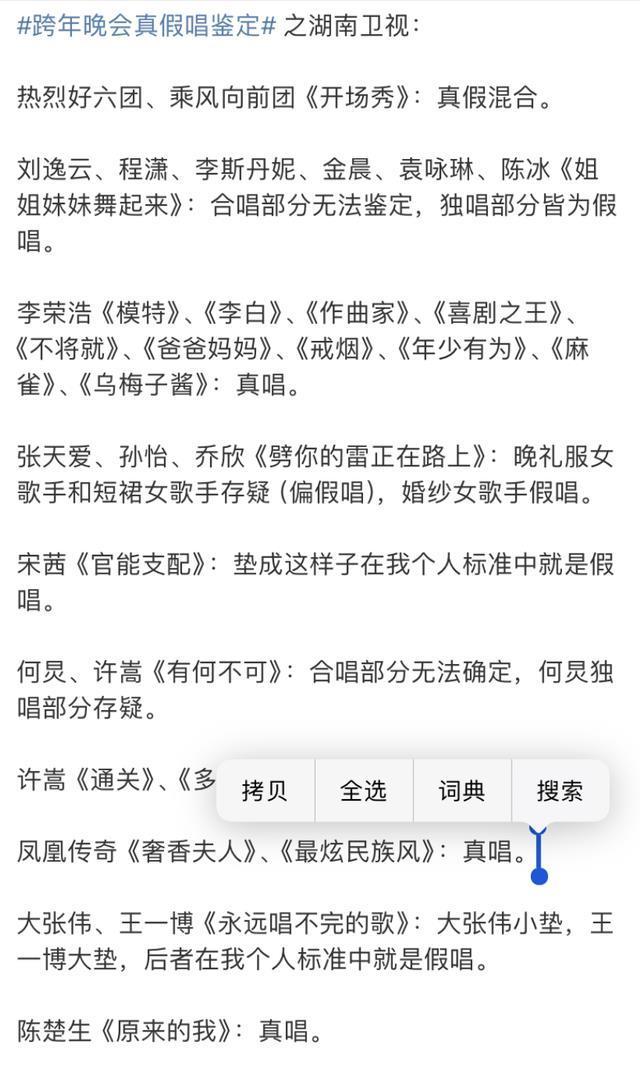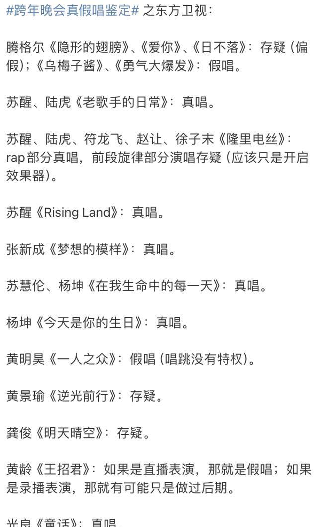 之后这位博主又对湖南卫视跨年晚会进行了分析,成果让东说念主大跌眼镜,就属湖南台假唱的最多,比如浪姐的齐唱,宋茜,大张伟,王一博,李现,虞书欣,赵露念念,王鹤棣,杨紫,魏大勋,成毅,期间少年团,黄晓明等等,不错说扫数演员基本全假唱。